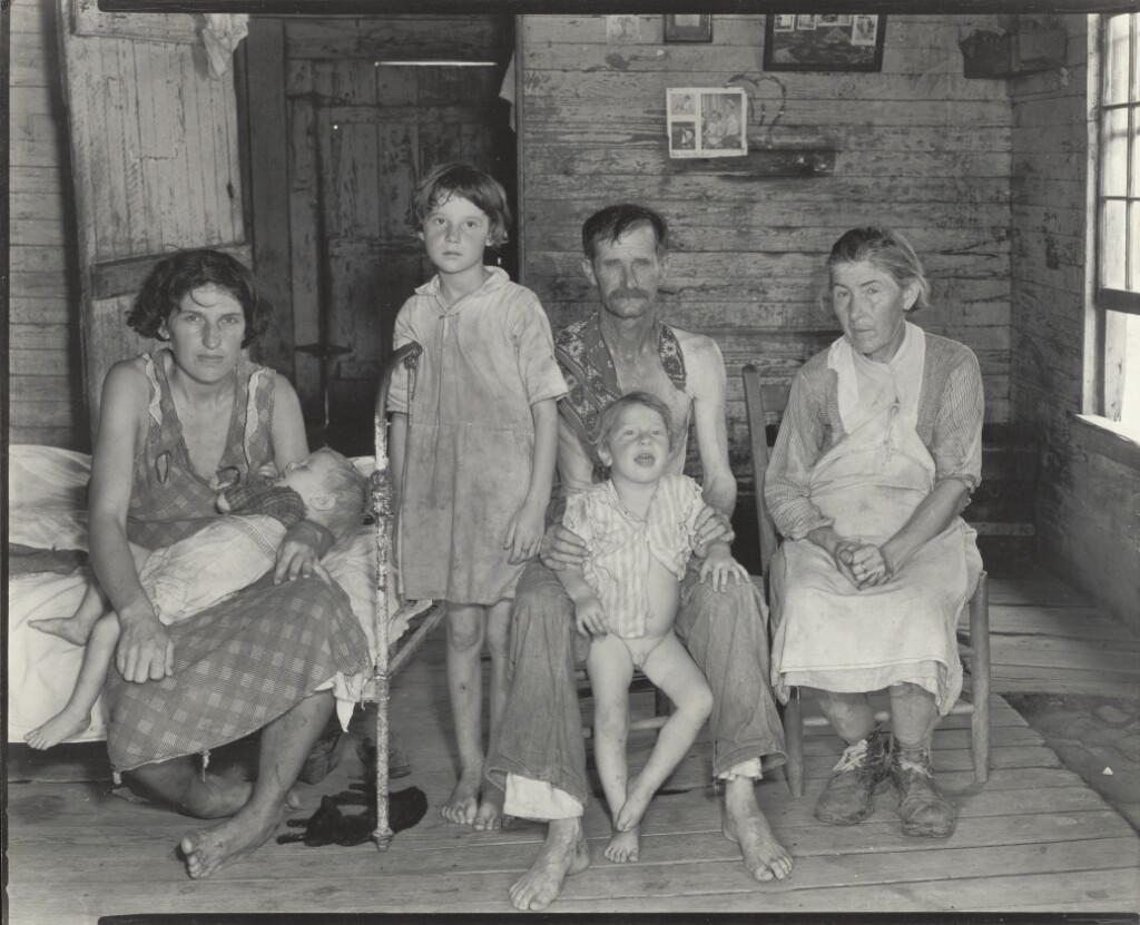 From mid-July to mid-September 1936, Evans took a leave from his position as an information specialist for the Historical Section of the Resettlement Administration to work with the writer James Agee on an assignment for Fortune magazine. They traveled to the Deep South to prepare an article on tenant cotton farming. In Alabama they documented the lives of farmers, including the Fields family. Evans found in this average American household the archetypal portrait of the everyman that he treasured. The straight-forward style of this portrait emphasizes the family’s hard life as much as their pride.
